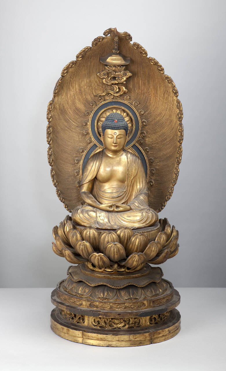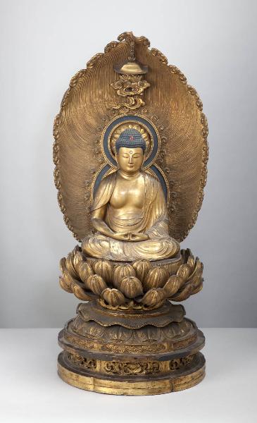 Statua in legno cavo, intagliato, laccato, dorato e parzialmente dipinto, raffigurante il Buddha Amida (in sanscrito Amitabha), vestito di una semplice tonaca che gli lascia scoperto il petto e seduto a gambe incrociate nella cosiddetta posizione 'del loto' sopra un fiore di loto, a sua volta sistemato su un piedistallo a più sezioni sovrapposte, più in basso a perimetro polilobato, verso il mezzo a contorno anulare con decorazione di foglie di loto.\nIl nimbo 'a mandorla' è ornato con una serie di linee parallele terminanti con riccioli che ricadono verso l'interno, così da simulare un flusso di onde. Lungo il bordo del nimbo si susseguono nubi. Al centro in alto è sistemato uno stupa, con pinnacolo e anelli, posato su fiore di loto e questo a sua volta su nubi. Più in basso si staglia l'aureola circolare della divinità, ornata all'interno da fiore di loto stilizzato.\nTra i due occhi della divinità è inserito il cosiddetto 'terzo occhio' in cristallo semitrasparente. Un altro inserto in vetro, di colore rosso, si vede sul davanti del capo, tra i riccioli dipinti in blu.