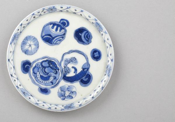 Piattino circolare in porcellana dipinto in blu al di sotto dell'invetriatura trasparente. Sulla superficie a vista si stagliano alcune riserve dalla cornice vagamente circolare, con andamento mosso: in alcune più piccole si vedono motivi vegetali, mentre in una più grande è visibile uno scorcio di paesaggio con figura umana.