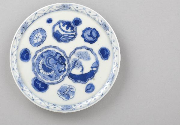 Piattino circolare in porcellana dipinto in blu al di sotto dell'invetriatura trasparente. Sulla superficie a vista si stagliano alcune riserve dalla cornice vagamente circolare, con andamento mosso: in alcune più piccole si vedono motivi vegetali, mentre in una più grande è visibile uno scorcio di paesaggio con figura umana.