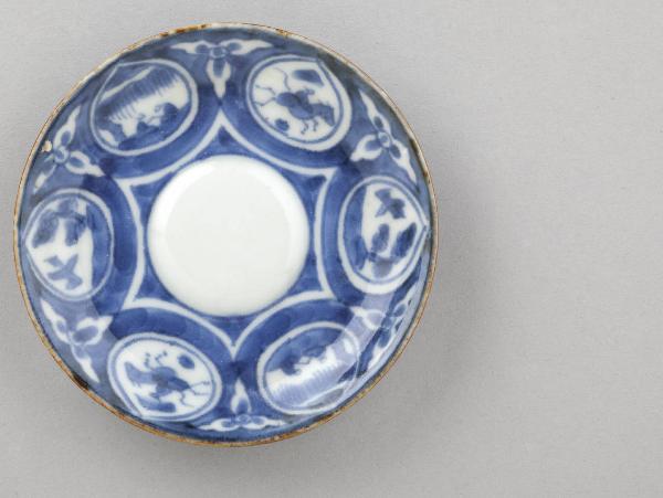 Piattino circolare in porcellana dipinto in blu al di sotto dell'invetriatura trasparente. Sulla superficie a vista, tra fondo e tesa, si stagliano radialmente sei riserve a goccia, all'interno di ognuna delle quali è raffigurata una piccola scena, tra scorci di paesaggio, figure, animali, fiori e uccelli.