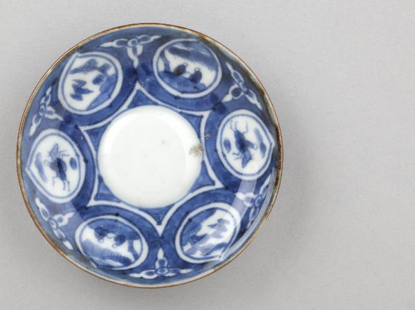 Piattino circolare in porcellana dipinto in blu al di sotto dell'invetriatura trasparente. Sulla superficie a vista, tra fondo e tesa, si stagliano radialmente sei riserve a goccia, all'interno di ognuna delle quali è raffigurata una piccola scena, tra scorci di paesaggio, figure, animali, fiori e uccelli.