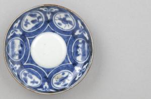 Piattino circolare in porcellana dipinto in blu al di sotto dell'invetriatura trasparente. Sulla superficie a vista, tra fondo e tesa, si stagliano radialmente sei riserve a goccia, all'interno di ognuna delle quali è raffigurata una piccola scena, tra scorci di paesaggio, figure, animali, fiori e uccelli.