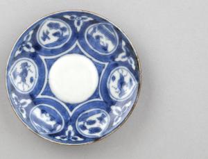 Piattino circolare in porcellana dipinto in blu al di sotto dell'invetriatura trasparente. Sulla superficie a vista, tra fondo e tesa, si stagliano radialmente sei riserve a goccia, all'interno di ognuna delle quali è raffigurata una piccola scena, tra scorci di paesaggio, figure, animali, fiori e uccelli.