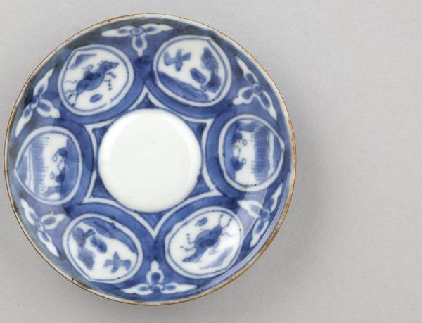 Piattino circolare in porcellana dipinto in blu al di sotto dell'invetriatura trasparente. Sulla superficie a vista, tra fondo e tesa, si stagliano radialmente sei riserve a goccia, all'interno di ognuna delle quali è raffigurata una piccola scena, tra scorci di paesaggio, figure, animali, fiori e uccelli.