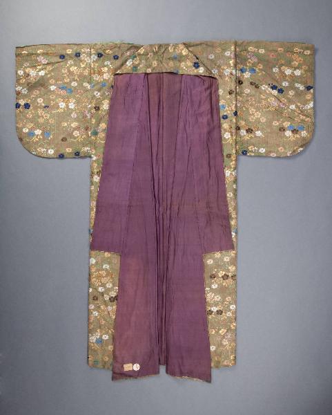 Abito da teatro di tipo karaori (letteralmente "tessitura cinese"). Armatura di fondo diagonale in seta opaca con fili laminati in oro e trame supplementari in seta lasciata "lenta" in modo da creare disegni che sembrino ricami. Colore di fondo bronzo, disegni in seta policroma e oro (in lamine) di fiori di pruno (ume) con tralci di rami a foglia verde disposti in modo sparso (chirashi moyo). Fodera color viola e maniche piccole (kosode).