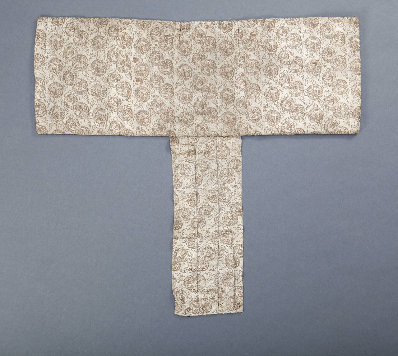 Tessuto di seta operata con trame supplementari in oro cartaceo. Si tratta di un accessorio di costume femminile a guisa di cintura a crociera in tela di seta bianca con disegno in oro di draghetti (ryu) a tre artigli avvolti in cerchio e nubi disposti in modo sparso (chirashi moyo). Rovescio di cotone a trama non fitta.