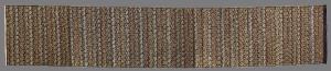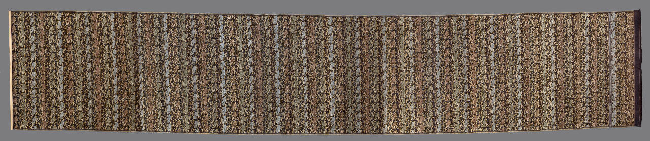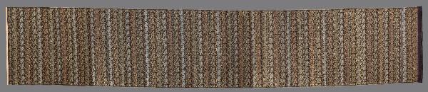 Tessuto operato con trame supplementari in seta. Tessuto marrone con motivo in oro e seta policroma di file di crisantemi (kiku) e pino (matsu) alternate a file di gru (tsuru) e nuvole (lumo). I motivi si ripetono in due varianti (crisantemi e pino/ crisantemo e fiori fantasiosi, gru rivolte verso destra/ gru rivolte verso sinistra) su file orizzontali, parallele a sfalsamento diagonale. Sul fondo sono sparsi emblemi augurali (takara zukushi).