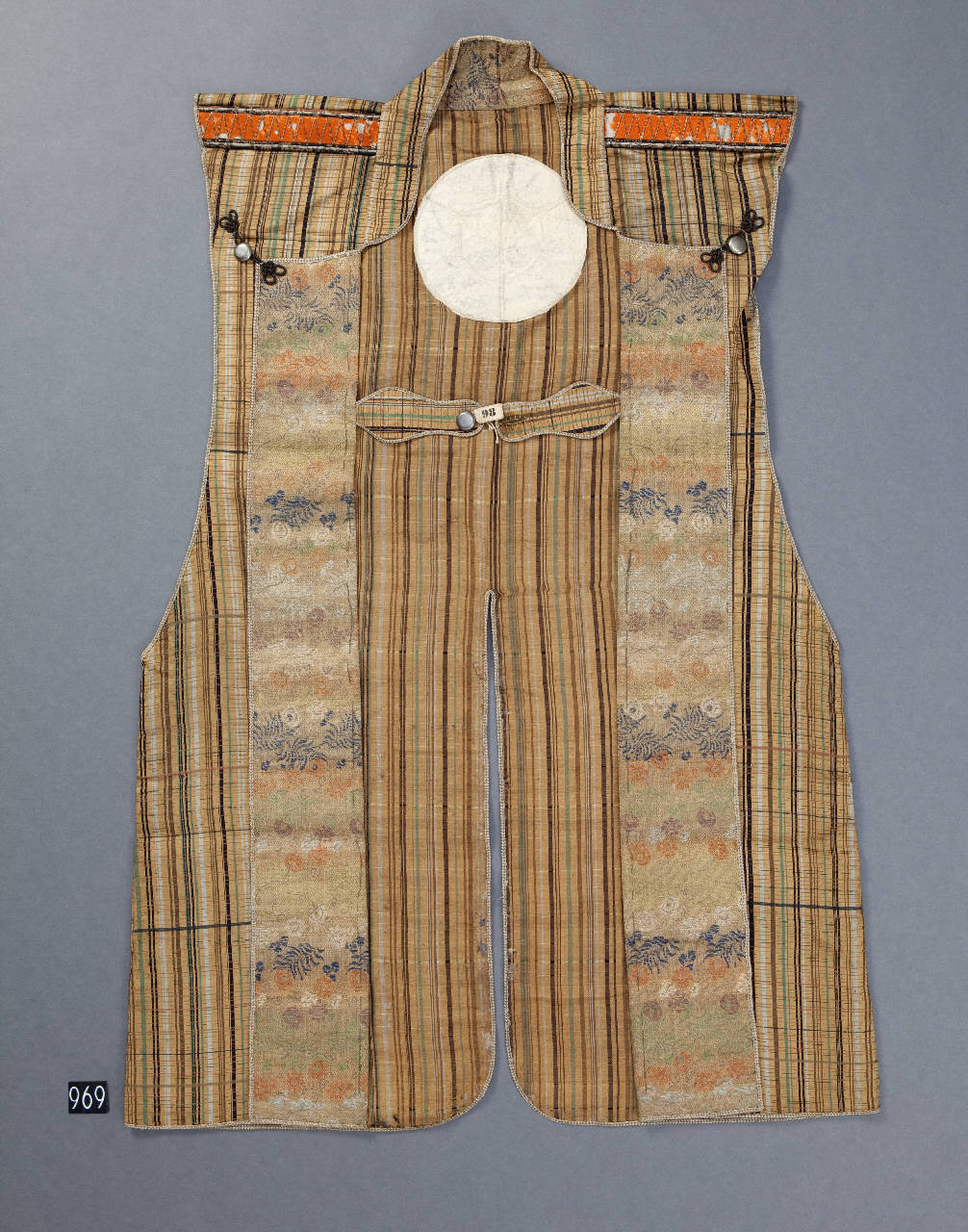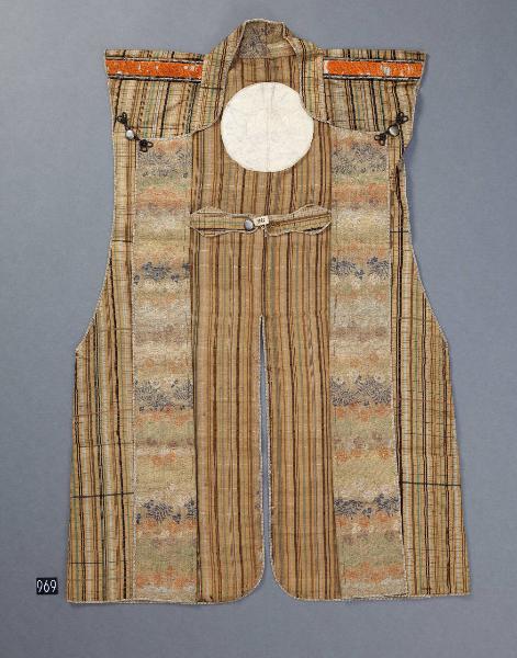Sopravveste maschile senza maniche (jinbaori) in tessuto operato con trame supplementari in oro e seta policroma. Sul fondo di seta gialla si sviluppa un motivo di righe di vario colore (verde, celeste e marrone) e diverse dimensioni che si intersecano con andamento parallelo e perpendicolare (koshi). Sui risvolti tessuto di seta operata con disegni policromi di fiori fantasiosi e fogliame disposti in modo sparso (chirashi moyo). Sul retro giustapposizione di stemma gentilizio (kamon) in lana rossa con stilizzazione di tre foglie di malva (aoi) entro cornice circolare. Spalline rosse.