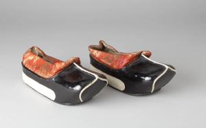 Paio di scarpe femminili (o da bambino?) in legno laccato di nero con mascherina in tessuto a fiorami rosso.