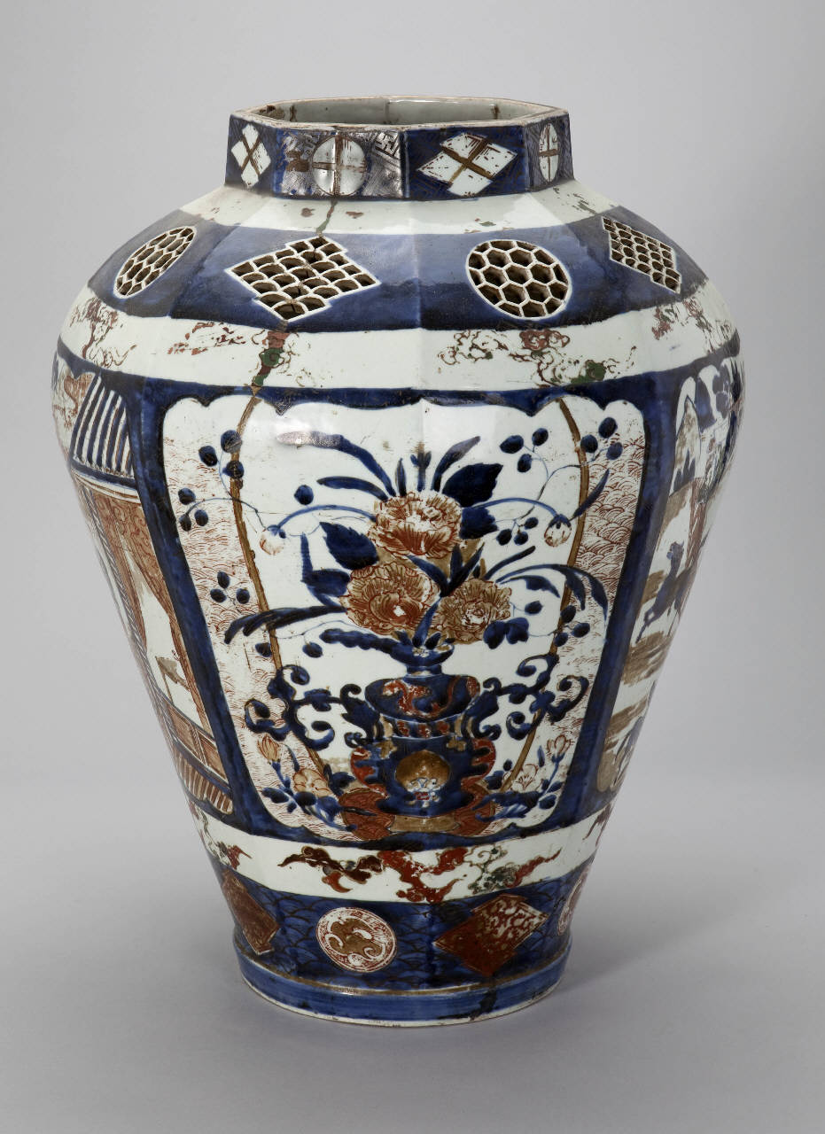 Vaso in a sezione circolare, privo di coperchio e con spalla bombata. Dipinto in blu di cobalto al di sotto dell'invetriatura trasparente, smalto rosso e oro sopra la coperta. Sul corpo si vedono quattro grandi riquadri a contorno lobato, all'interno di due dei quali è un grande vaso colmo di fiori, negli altri due una scena analoga con un uomo in piedi nei pressi di un padiglione che guarda due cavalli in un recinto; sullo sfondo un brano di paesaggio con colline, alberi e abitazioni. Sulla spalla si alternano motivi traforati, circolari e a losanga. Verso la base si ritrovano gli stessi motivi però dipinti.