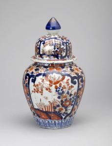 Vaso in porcellana a sezione circolare con spalla bombata e coperchio a calotta emisferica. La decorazione - dipinta in blu di cobalto steso al di sotto dell'invetriatura trasparente, smalto rosso e oro al di sopra della coperta - consiste in motivi vegetali e floreali. Il coperchio ha presa a forma di pomello.