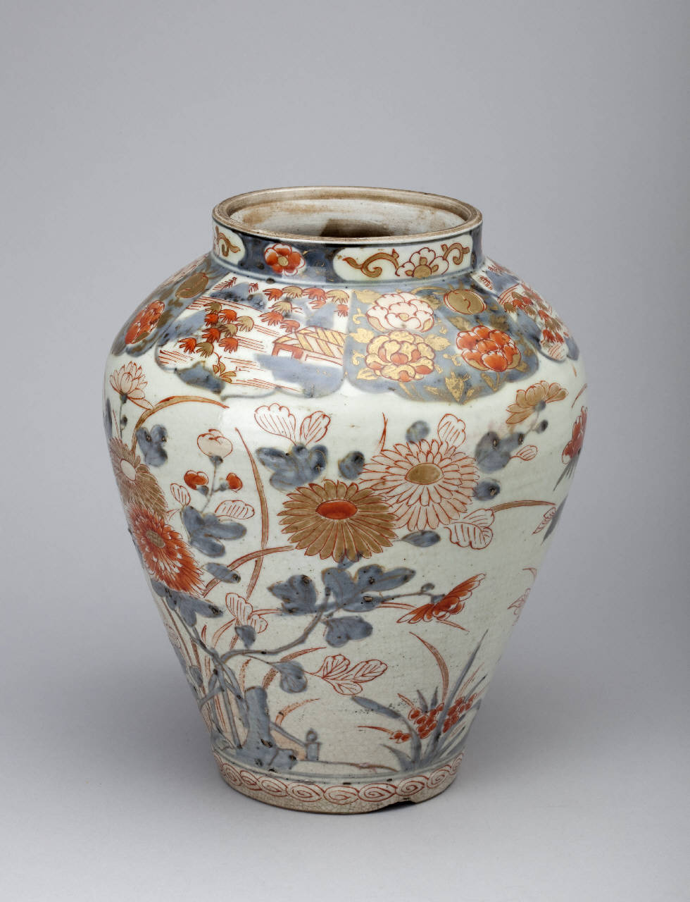 Vaso in porcellana a sezione circolare con spalla bombata. Manca il coperchio, presumibilmente a calotta emisferica. La decorazione - dipinta in blu di cobalto steso al di sotto dell'invetriatura trasparente, smalto rosso e oro al di sopra della coperta - consiste in motivi vegetali e floreali sparsi.