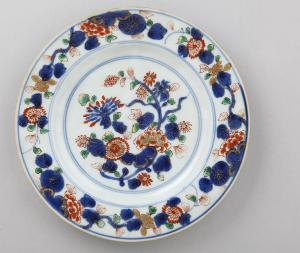 Piatto in porcellana di forma circolare. Decorazione floreale dipinta in blu di cobalto sotto l'invetriatura trasparente, smalto rosso e oro al di sopra della coperta.