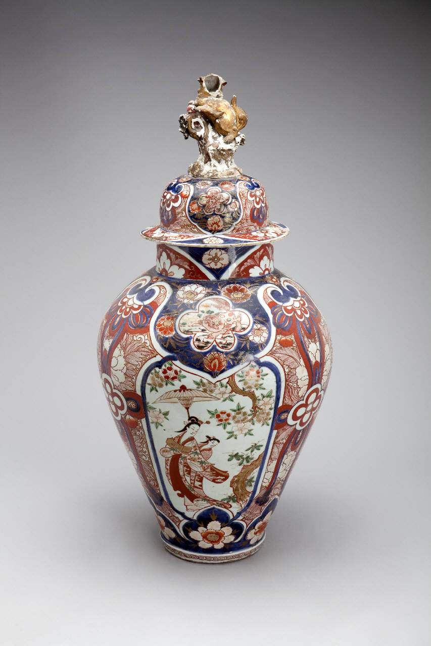 Vaso in porcellana a sezione circolare con spalla bombata, collo cilindrico, coperchio a calotta emisferica con tesa piatta e presa a forma di "leone cinese" (karashishi). La decorazione - dipinta in blu di cobalto steso al di sotto dell'invetriatura trasparente, smalti rosso, verde e nero e diffusi tocchi di oro al di sopra della coperta, consiste in una fitta decorazione floreale interrotta sul corpo da una serie di grandi riserve polilobate, all'interno di ognuna delle quali una scena con dame in giardino.