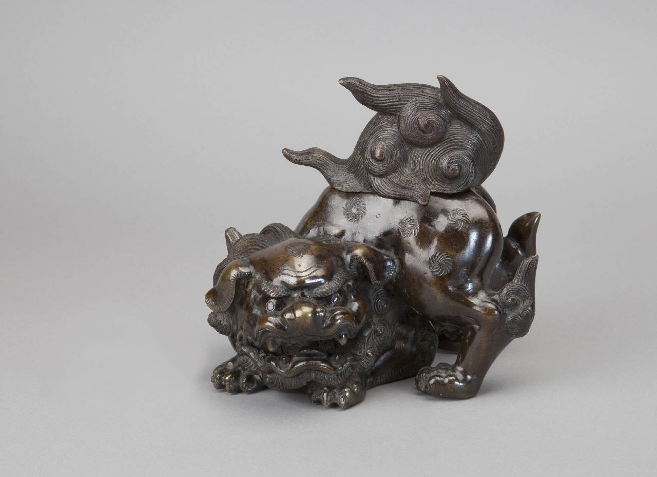 Bruciaprofumi (koro) in bronzo lavorato a fusione (chukin) in forma di "leone cinese" (karashishi). La coda ricciuta funge da coperchio.