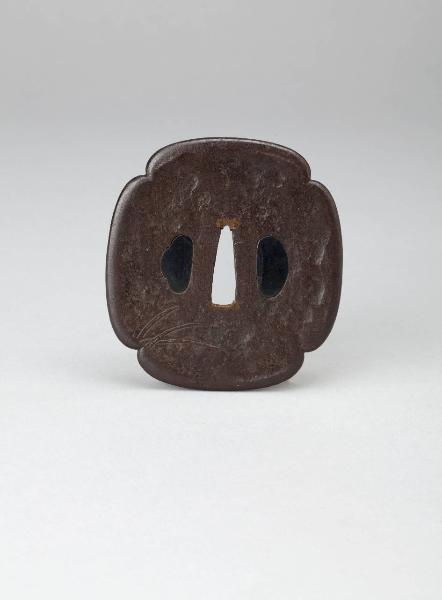Tsuba in ferro di forma quadrilobata ornato in agemina e doratura con motivo di erbe.