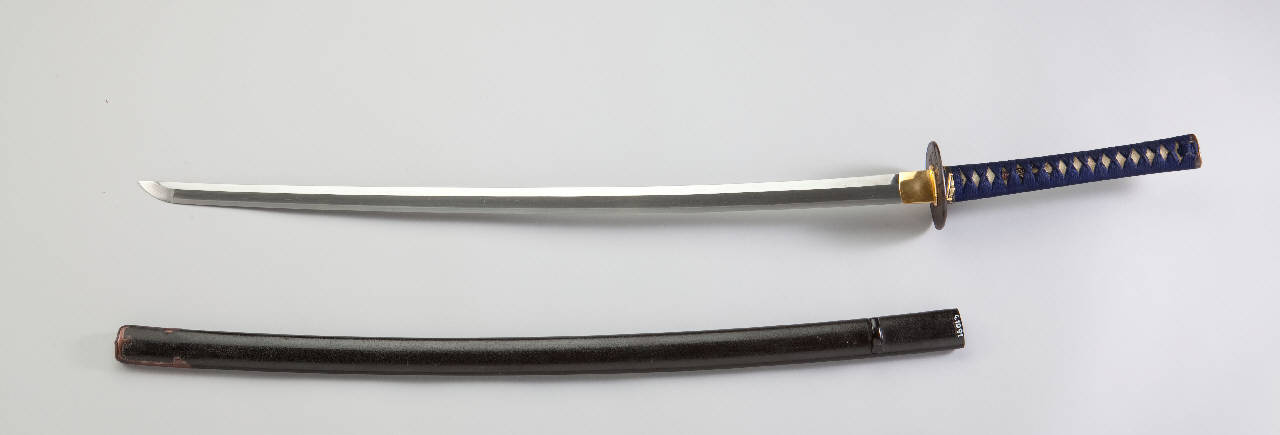 Spada (katana) con lama in acciaio. Impugnatura (tsuka) rivestita di tessuto blu (itomaki) su pelle di pesce (same). Fodero (saya) in legno laccato di nero (roironuri) con anello (kurigata). Finimenti in metallo parzialmente dorato; menuki a forma di aragosta. Tsuba circolare in ferro lavorata a rilievo con doratura, con scena con due figure di saggi cinesi e suppellettili. Manicotto (habaki) in metallo dorato con incisioni.