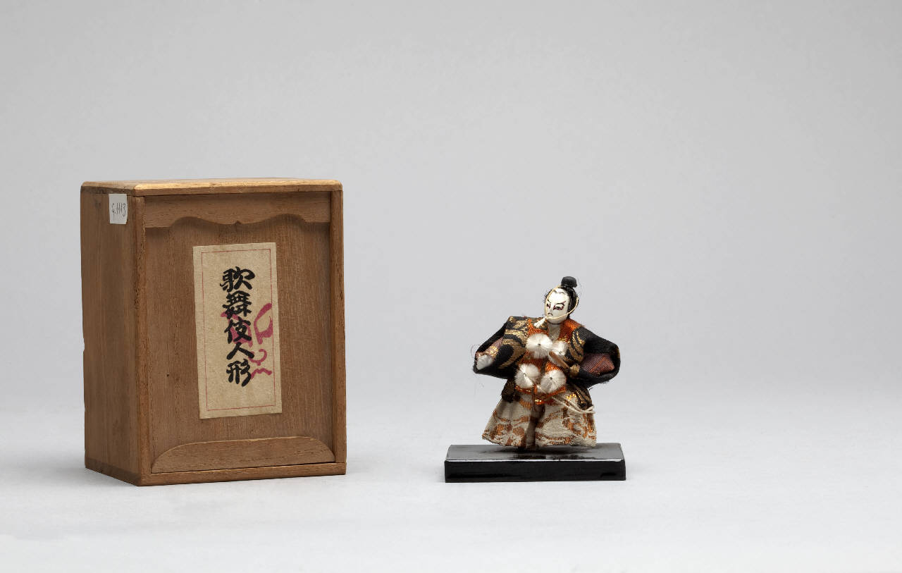 Piccola scultura in legno dipinto, con abiti in tessuto, raffigurante un samurai. Posa su base in legno e ha sua scatola in legno.
