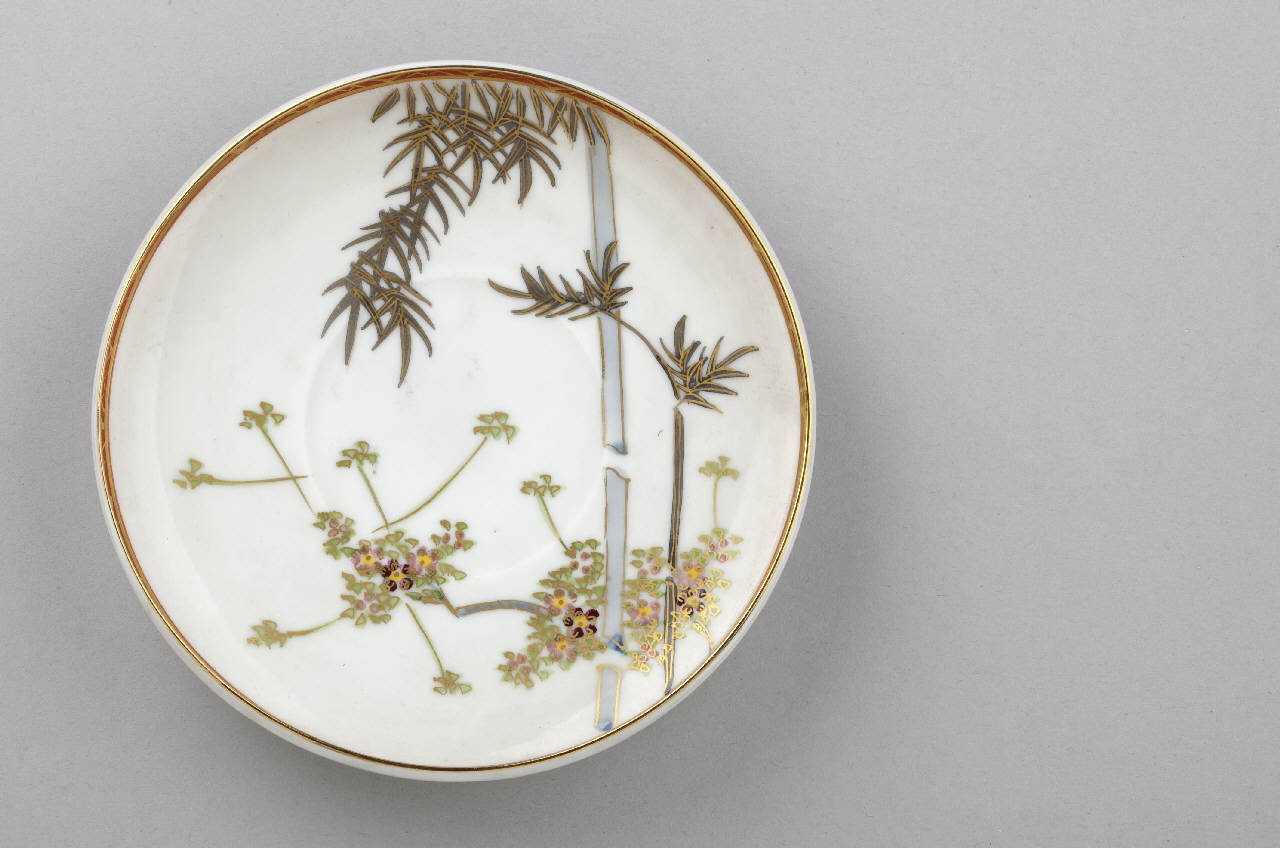 Piattino per tazza da the in porcellana bianca molto sottile, dipinta al di sopra dell'invetriatura con motivi vegetali e bordura geometrica.