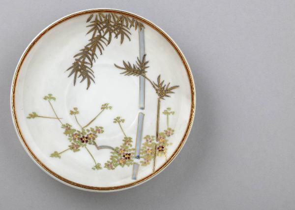 Piattino per tazza da the in porcellana bianca molto sottile, dipinta al di sopra dell'invetriatura con motivi vegetali e bordura geometrica.