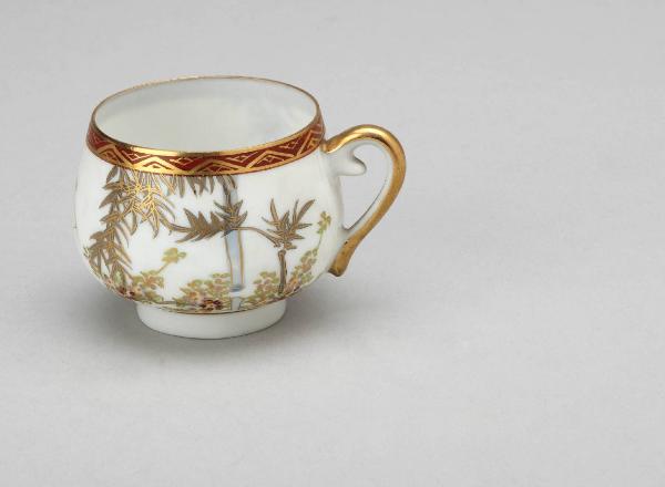 Tazza da caffè in porcellana bianca molto sottile, dipinta al di sopra dell'invetriatura con motivi vegetali e bordura geometrica. Ha piede circolare e manico.