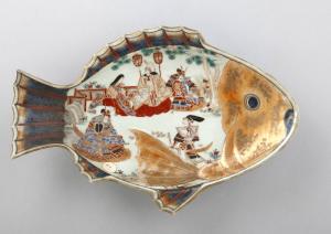 Piatto in porcellana dipinta, dorata e invetriata a forma di pesce. Sul fondo è raffigurata una composizione ambientata all'aperto con quattro samurai e una dama.