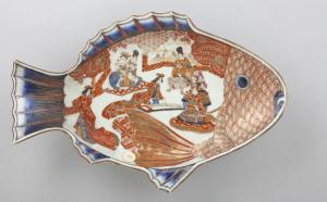 Piatto in porcellana dipinta, dorata e invetriata a forma di pesce. Sul fondo è raffigurata una composizione ambientata all'aperto con quattro samurai e una dama.