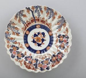 Piatto in porcellana, dipinto in blu di cobalto al di sotto dell'invetriatura trasparente, smalto rosso al di sopra della coperta e diffuse dorature. Modellato in sgusci disposto radialmente sulla parete, presenta una ricca composizione floreale.