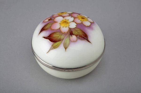 Scatola a sezione circolare composta di due metà di dimensioni all'incirca equivalenti. In metallo, è ornata a smalti policromi su fondo bianco con una composizione di fiori. L'interno è in nero. (cloissoné)
