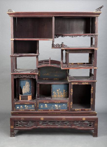 Scaffale (tana) a più ripiani (alcuni dei quali chiusi a cassetto o da porte a soffietto) in legno. Vi si sovrappone una decorazione a oro in maki-e ("pittura cosparsa") con motivi vegetali. Sono inoltre presenti alcuni pannelli in legno laccati di blu con decori floreali a oro e intarsi di madreperla (raden).