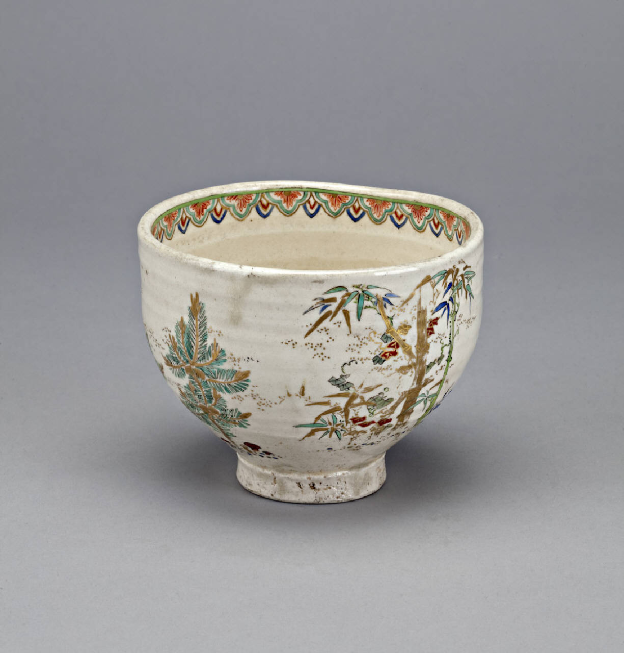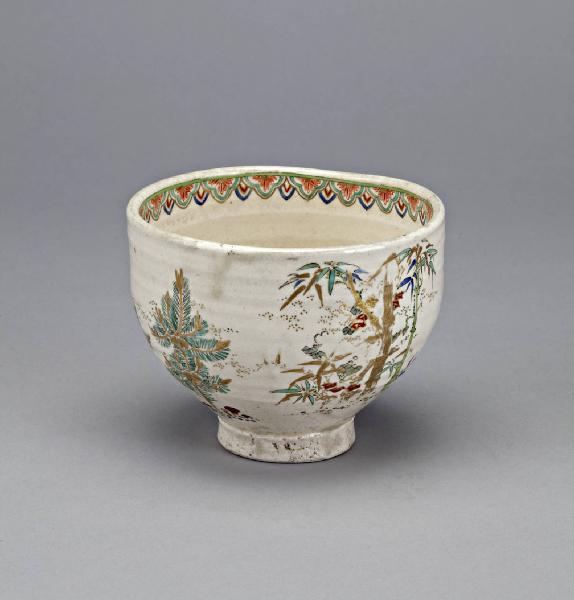 Tazza da tè (chawan) in ceramica dipinta a smalti e diffuse dorature. La semplice decorazione è di tipo floreale con piante e fiori di vario genere tra cui pruno e bambù.