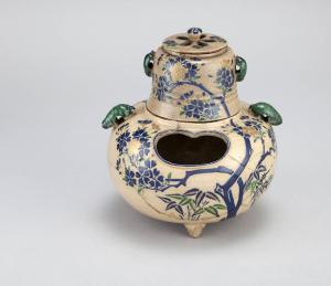 - NOTIZIE STORICO CRITICHE Oggetto complesso di stile Satsuma, databile alla seconda metà del XIX secolo. E' interessante notare che un oggetto di forme del tutto analoghe a quelle che caratterizzano questo esemplare compare in un disegno di Soami (1472?-1525) per il suo Kundaikan sochoki ("Manuale della collezione dello shogun di arte cinese"), conservato in una copia del 1559 nella Tohoku Library di Sendai.