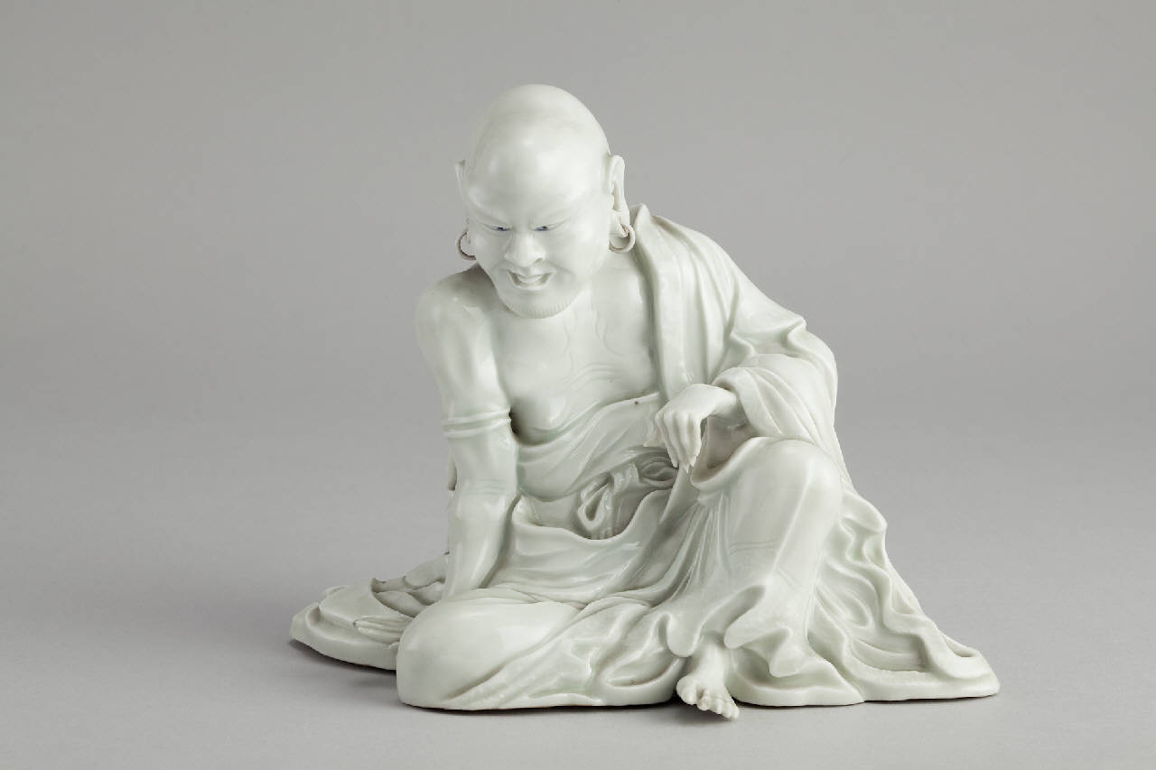 Statuetta in porcellana invetriata raffigurante un rakan seduto, con la gamba sinistra sollevata al ginocchio, sulla quale posa il braccio sinistro. Vestito solo di un'ampia tonaca che lascia scoperti parte del torso e il braccio destro, ha lobi delle orecchie allungati con orecchini ad anello, cranio rasato, ed è accentuatamente smagrito. I dettagli della composizione sono realizzati a incisione e leggerissimo rilievo al di sotto dell'invetriatura.