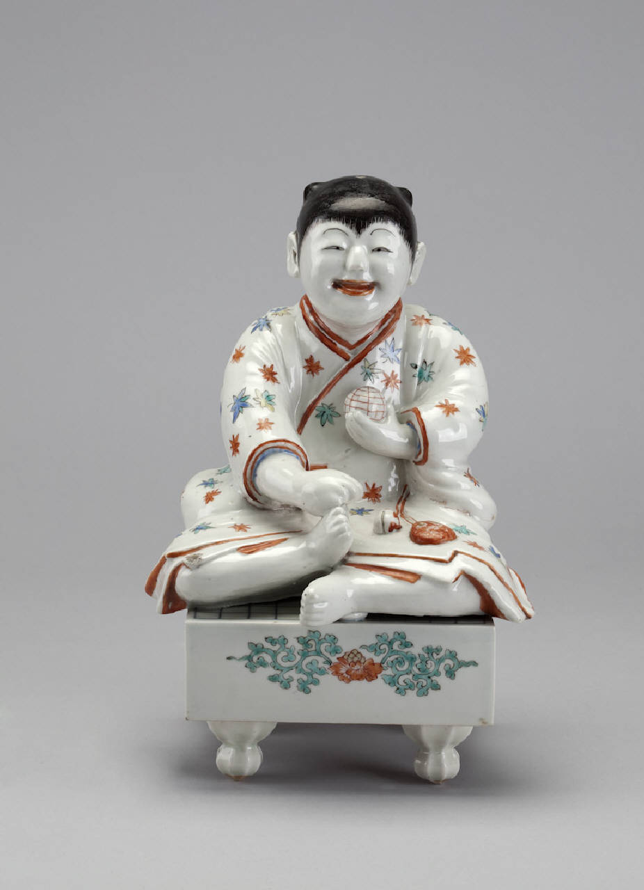 - NOTIZIE STORICO CRITICHE Raffinato esemplare di produzione ceramica delle fornaci di Arita, isola di Kyushu, nei decenni finali del XVII secolo. Per il tipo di impasto e di smalti fa parte della tipologia cosiddetta Kakiemon. Oggetti analoghi a questo furono importati in Europa già nel tardo XVII secolo, come l'esemplare conservato a Burghley House. Altri pezzi simili si trovano in musei inglesi, tra cui l'Ashmolean di Oxford, il British e il Victoria & Albert di Londra.\nSecondo alcuni autori, il bambino cosi rappresentato e un'immagine di Hotei, mentre secondo gli studiosi del Museo della Ceramica del Kyushu, la statuetta rappresenta un bambino che, raggiunti i cinque anni, si presta alla cerimonia del taglio dei capelli. L'associazione con la tavola del Go alluderebbe dunque all'età. Potrebbe inoltre trattarsi di una marionetta goban ningyo, oggetto ludico nel quale una "bambola [balla] sulla scacchiera" del Go o su un tavolo. Si tratta di una produzione nello stile Kakiemon, molto raffinata e apprezzata in Europa per l'alta qualità della porcellana, dove le figure\nsono modellate a stampo con linee della scacchiera in blu sottocoperta tendente al nero su un impasto bianco latte detto nigoshide. Questo modello è stato prodotto in discreta quantità e si trova, simile, al British Museum, alla Burghley House di Stamford e all'Ashmolean Museum di Oxford, talvolta con fusciacche diverse e un oggetto differente in mano.