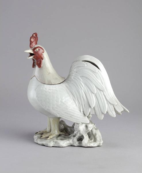 Statuetta in porcellana invetriata, con tocchi di smalto rosso, raffigurante un galletto. In due parti.