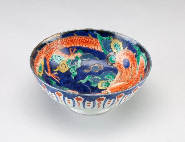 Scodella a sezione circolare posante su base ad anello in porcellana invetriata e dipinta a smalti policromi. All'interno la decorazione mostra un drago tra le nuvole che insegue il Gioiello Sacro. Sull'esterno, dall'orlo verso il centro della parete, con dentellatura e fiore stilizzato.