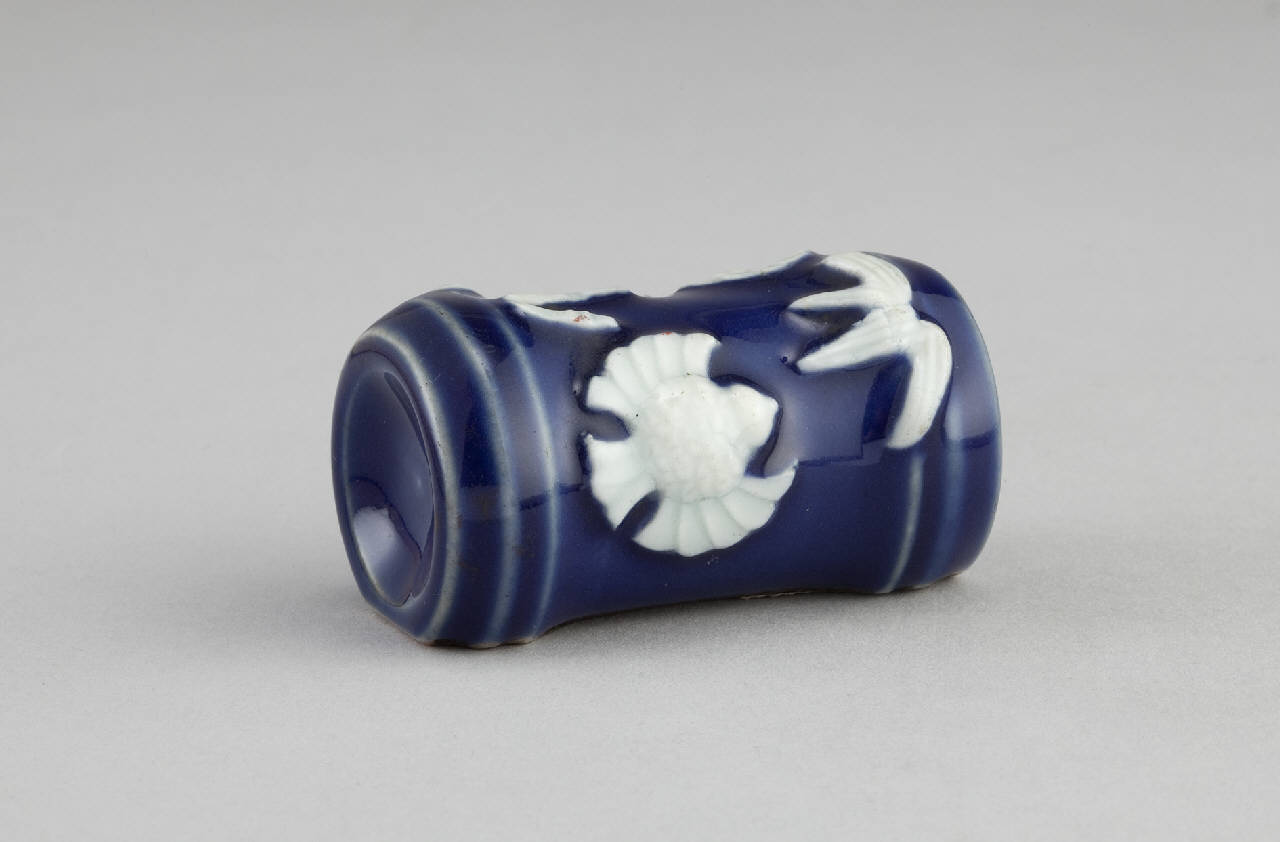 Fermacarte in porcellana invetriata, smaltata e lavora ad alto rilievo, a forma di sezione di fusto di bambù sul quale si posano uccelli e foglie.