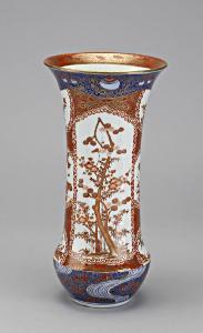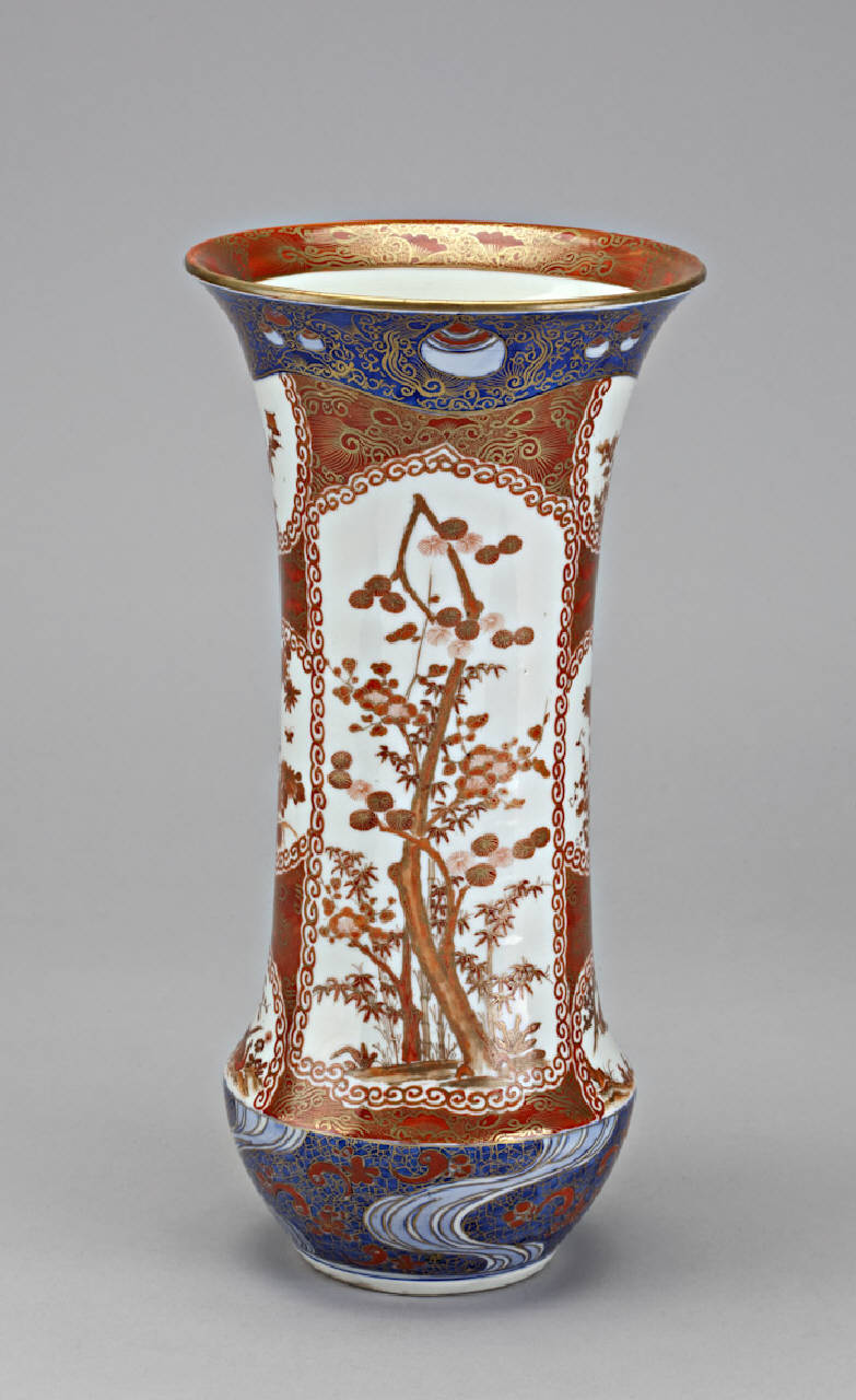 Vaso 'a tromba' in porcellana invetriata, dipinta a smalti policromi e arricchita da diffusi tocchi d'oro. La decorazione, disposta su tutta la superficie esterna del pezzo, consiste in ornati floreali di vario genere.