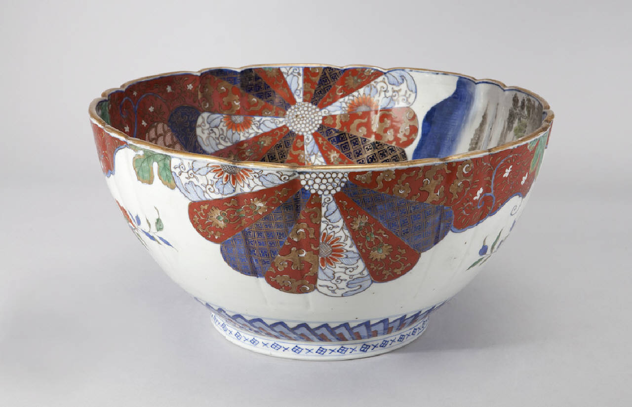 Grande bacile in porcellana invetriata, dipinta a smalti policromi e arricchita da diffusi tocchi d'oro. La parete e l'orlo sono modellati a sgonfi regolari. La decorazione consiste in ornati floreali di vario genere, medaglioni sparsi a forma di corolla di crisantemo stilizzato con motivi geometrici all'interno. All'interno si vede anche uno scorcio di paesaggio lacustre con uccelli.