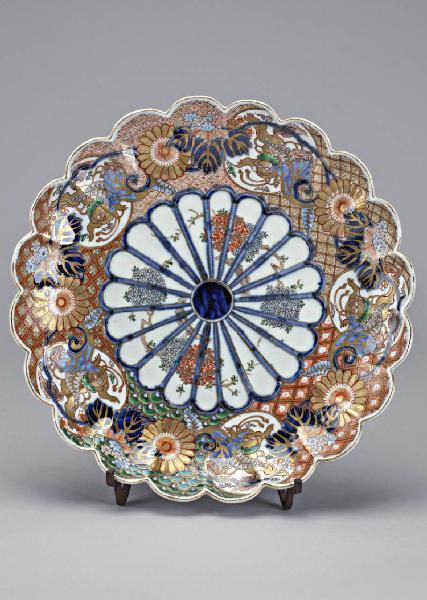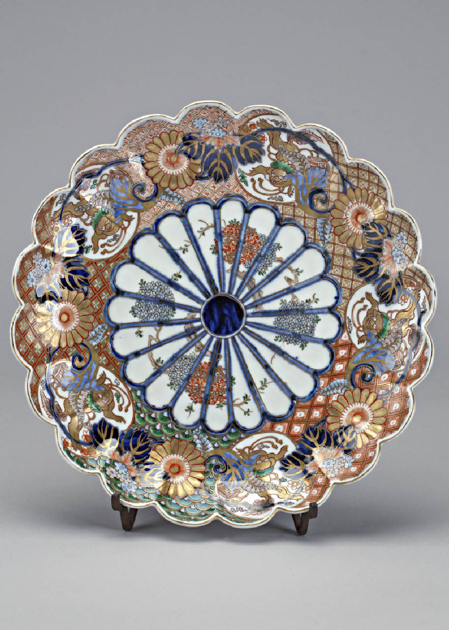 Piatto in porcellana invetriata, dipinta a smalti policromi e arricchita da diffusi tocchi d'oro. La parete e l'orlo sono modellati a sgonfi regolari, così simulando la forma di una corolla di crisantemo stilizzata. La decorazione, di tipo "broccato" (nishiki-e), riprende il motivo del crisantemo stilizzato al centro del fondo. Sulla superficie rimanente ornati floreali e geometrici.