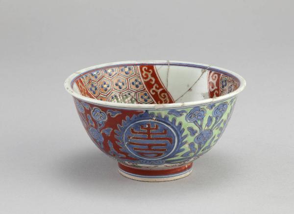 Tazzina in porcellana invetriata, dipinta a smalti policromi e arricchita da diffusi tocchi d'oro. Posa su base ad anello. La decorazione consiste principalmente di bande verticali con decorazioni floreali e geometriche. Sull'esterno e sul fondo all'interno, medaglioni con l'ideogramma per "longevità".