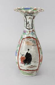 Vaso in porcellana invetriata, dipinta a smalti policromi e arricchita da diffusi tocchi d'oro. Ha sezione circolare, con ampiezza massima nei pressi del corpo che si restringe nei pressi del collo per poi riampliarsi accentuatamente verso la bocca, che ha orlo ondulato. La decorazione consiste in un tappeto di fiori sparsi sul quale si sovrappongono quattro medaglioni a cornice mossa: due più piccoli verso il collo con scorci di paesaggio; due più grandi sul corpo con figure nel paesaggio.