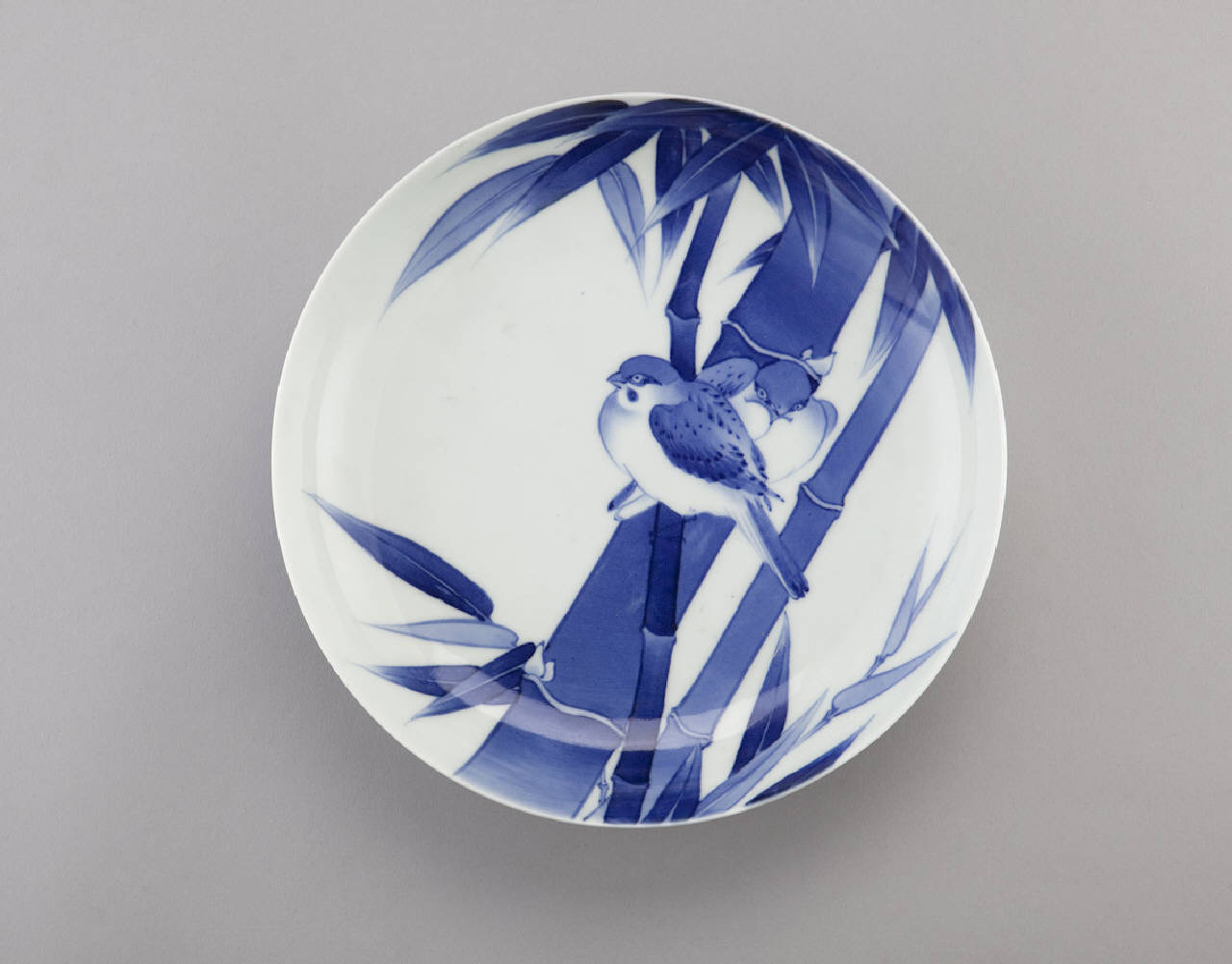 Piatto (sara) circolare in porcellana dipinta a smalto blu di cobalto sotto invetriatura trasparente. La decorazione mostra sulla superficie a vista una composizione con due passeri e fusti di bambù (take).