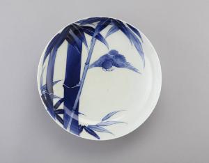 Piatto (sara) circolare in porcellana dipinta a smalto blu di cobalto sotto invetriatura trasparente. La decorazione mostra sulla superficie a vista una composizione con un passero e fusti di bambù (take).