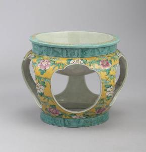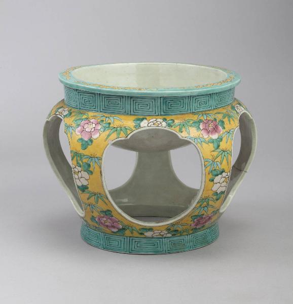Portavasi a sezione circolare in porcellana dipinta a smalti policromi stesi al di sopra dell'invetriatura. Catino semisferico in alto, posato su quattro gambe ricurve. Fasce geometriche verso la bocca e verso la base; sul corpo fiori sparsi di tipo naturalistico su fondo giallo.