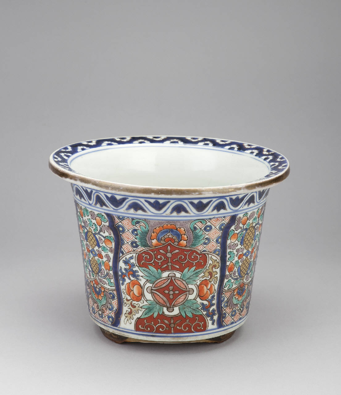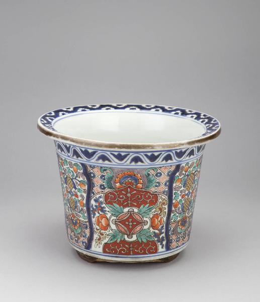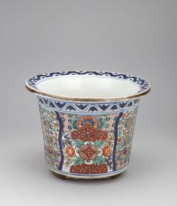 Vaso da giardino (yoki) in porcellana dipinta a smalti policromi. A sezione circolare, posa su piedini a mensola e ha l'orlo della bocca leggermente inclinato. La decorazione consiste in motivi geometrici e floreali.
