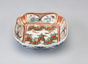 Ciotola in porcellana dipinta a smalti policromi e arricchita da tocchi d'oro. Ha le quattro pareti modellate a ogive. La decorazione consiste di motivi floreali, onde e uccelli disposti entro cartigli.
