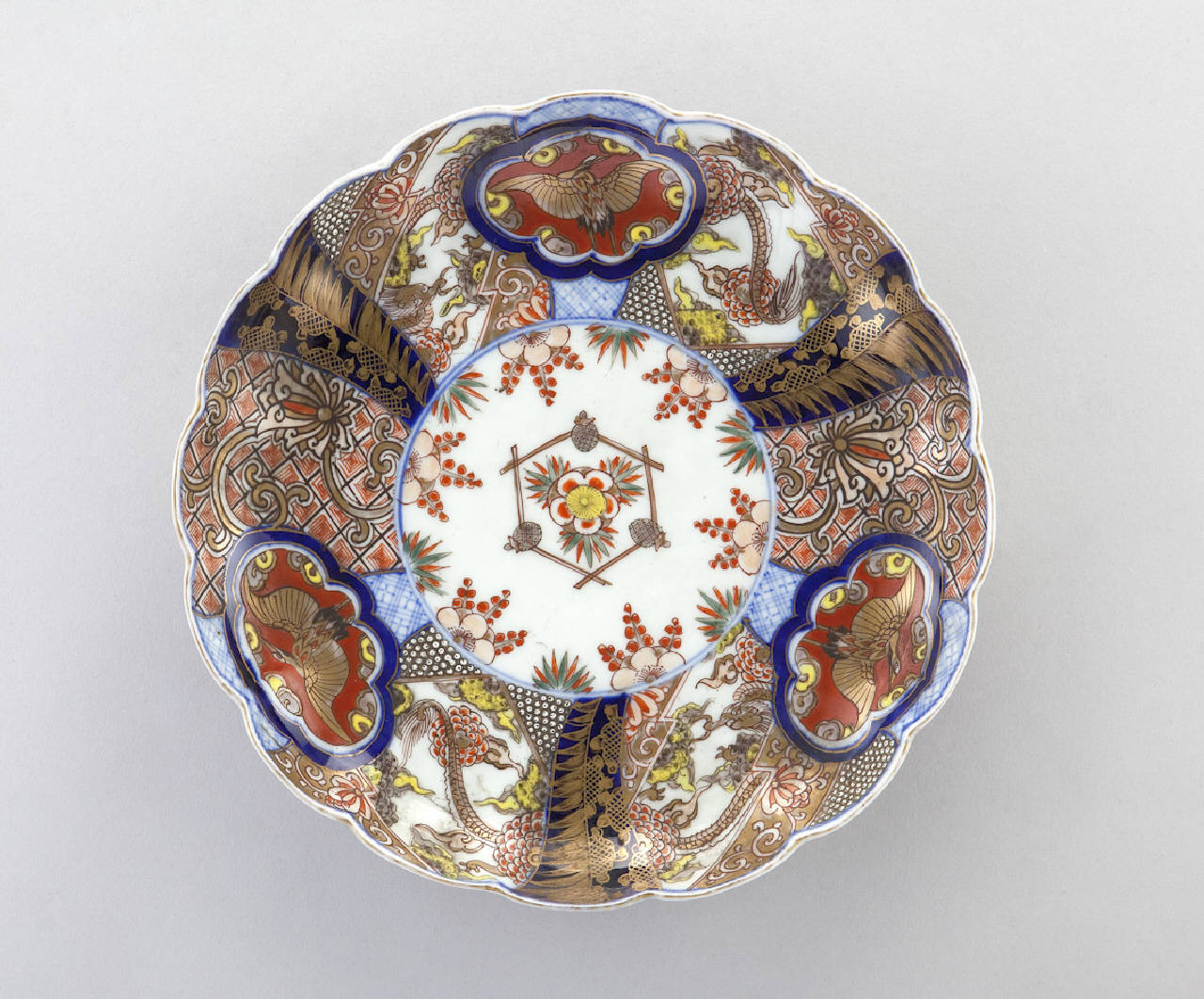 Piatto in porcellana dipinta a smalti policromi e arricchita da tocchi d'oro. Ha parete e orlo sagomati in sgonfi regolari, così che il piatto ricorda per forma una corolla stilizzata di crisantemo (kiku). La decorazione consiste in un medaglione centrale intorno al quale si dispone una pannellatura radiale con motivi floreali e geometrici, draghi (ryu) e gru (tsuru).