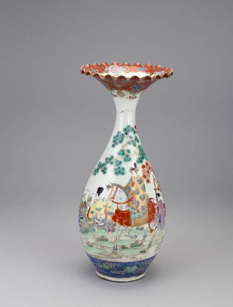 Vaso in porcellana dipinta a smalti policromi e arricchita da tocchi d'oro. Ha sezione circolare, con diametro massimo nella parte inferiore del corpo che si restringe gradualmente fino a diventare minimo verso il collo, per poi ampliarsi nuovamente fino alla bocca, la quale si presenta con modellato ondulato. La decorazione consiste in una scena continua con un corteo di personaggi immersi in un ricco paesaggio, tra fiori e alberi di vario genere. Verso la base e verso la bocca bande con motivi floreali.