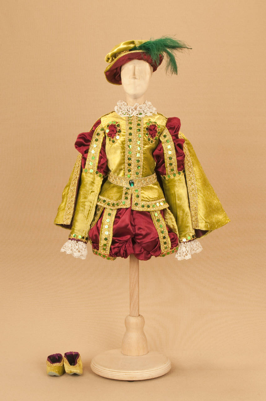 Costume da nobiluomo di foggia cinquecentesca composto da braghe, farsetto, cintura, cappa, scarpe e cappello.